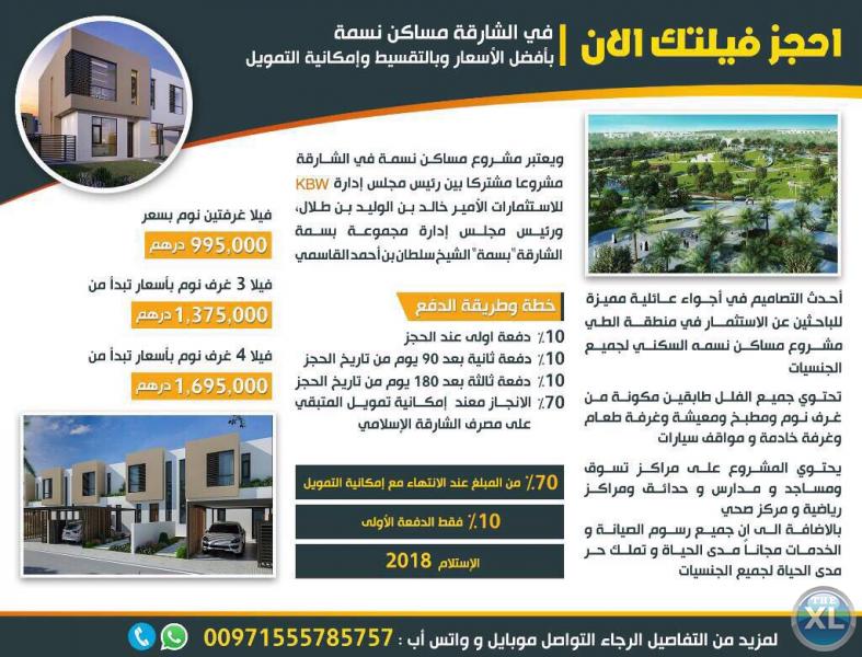 تملك في احد اهم مشاريع الشارقه (مساكن نسمه) بالتقسيط