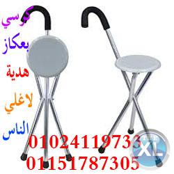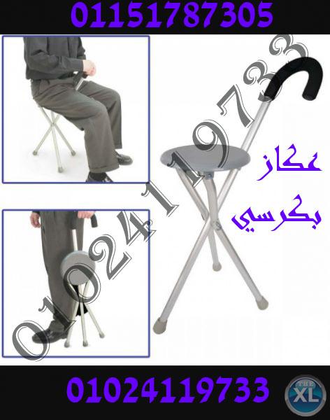عكاز مستورد يمكن فرده ككرسى برجل ثلاثى وله قاعدة صغيرة بلاستيك ويُعرف باسم كرسى عكاز