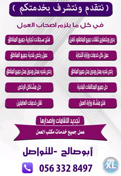 نتقدم ونتشرف بخدمتكم في كل ما يلزم اصحاب العمل تصاريح تنقلات جميع المناطقفتح سجلات تجارية جميع المناطقعمل كل خدمات وزارة التجارة عمل رخص بلدية جميع المناطقرخص بلديه بمحل وبدون محل جميع المناطقحل جميع المخالفات للبلدية حل مشاكل الرخص عمل جميع خدمات البلدية فتح منشاة وزارة العمل نقل خدمات العاملين تجديد الاقامات واصدارها عمل جميع خدمات مكتب العمل للتواصل : 0563328497 أبوصالح
