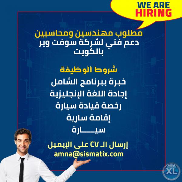 مطلوب مهندسين ومحاسبين دعم فني لشركة سوفت ويرشروط الوظيفةخبرة ببرنامج الشاملإجادة تامة للغة الإنجليزيةرخصة قيادة سيارةإقامة ساريةسيارةالرجاء إرسال الـ CV على الإيميلamna@sismatix.com